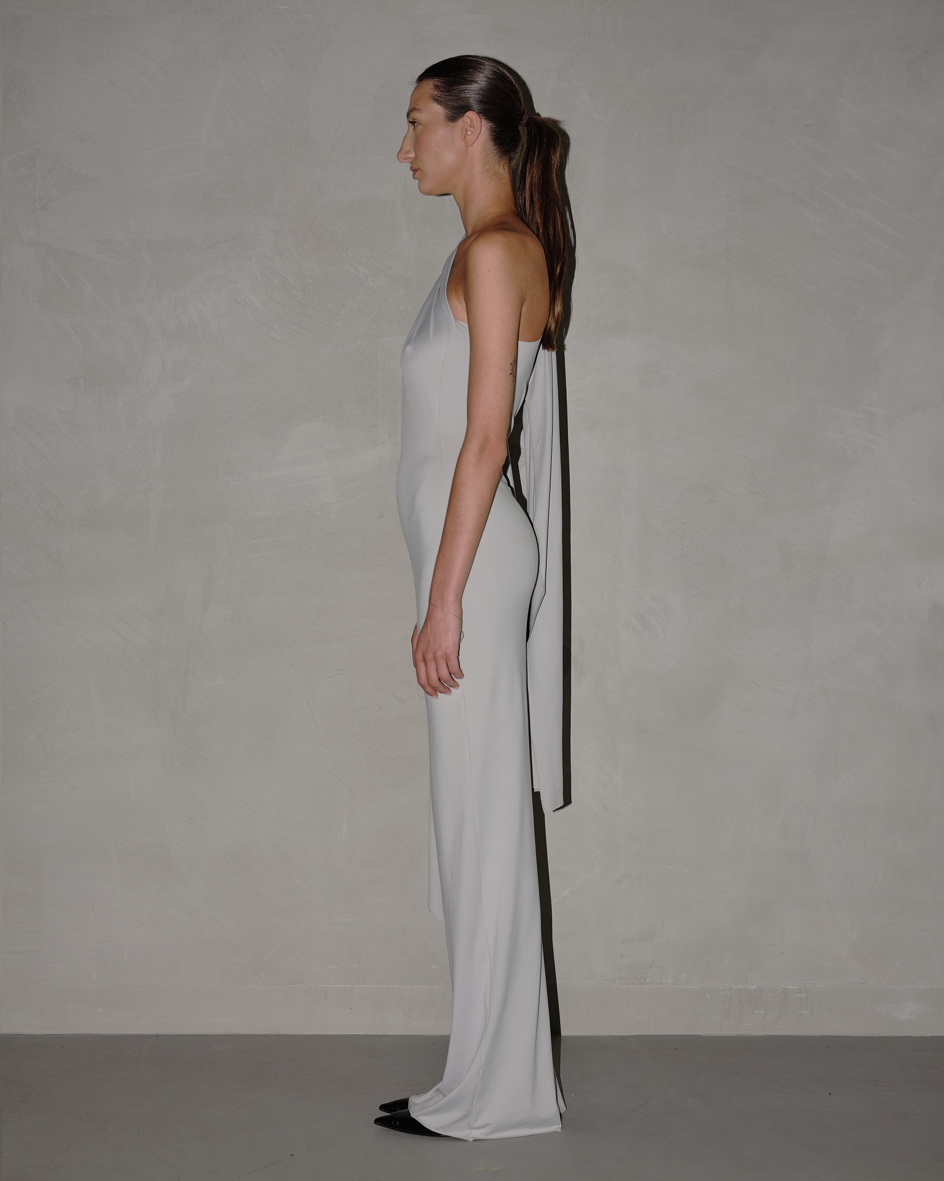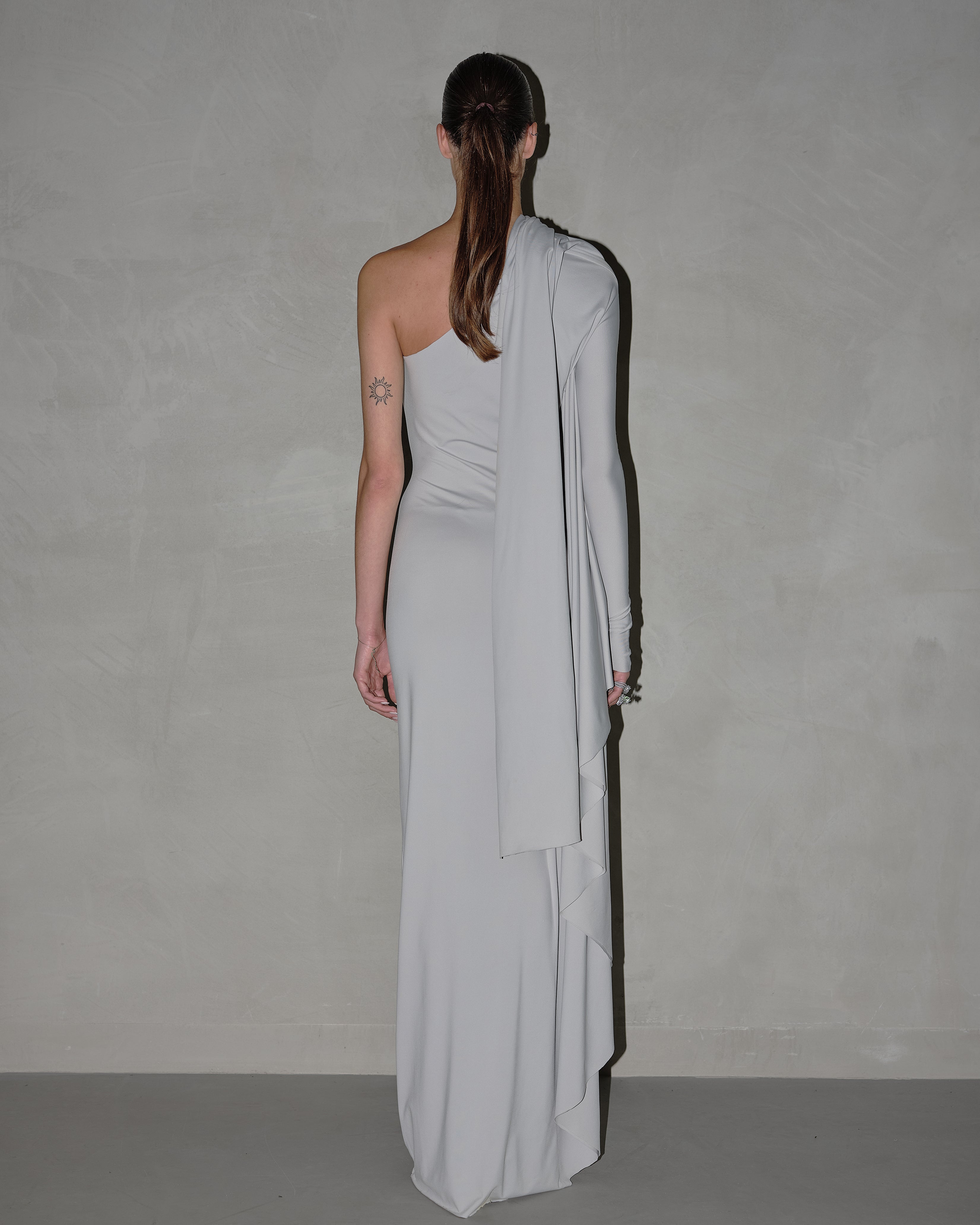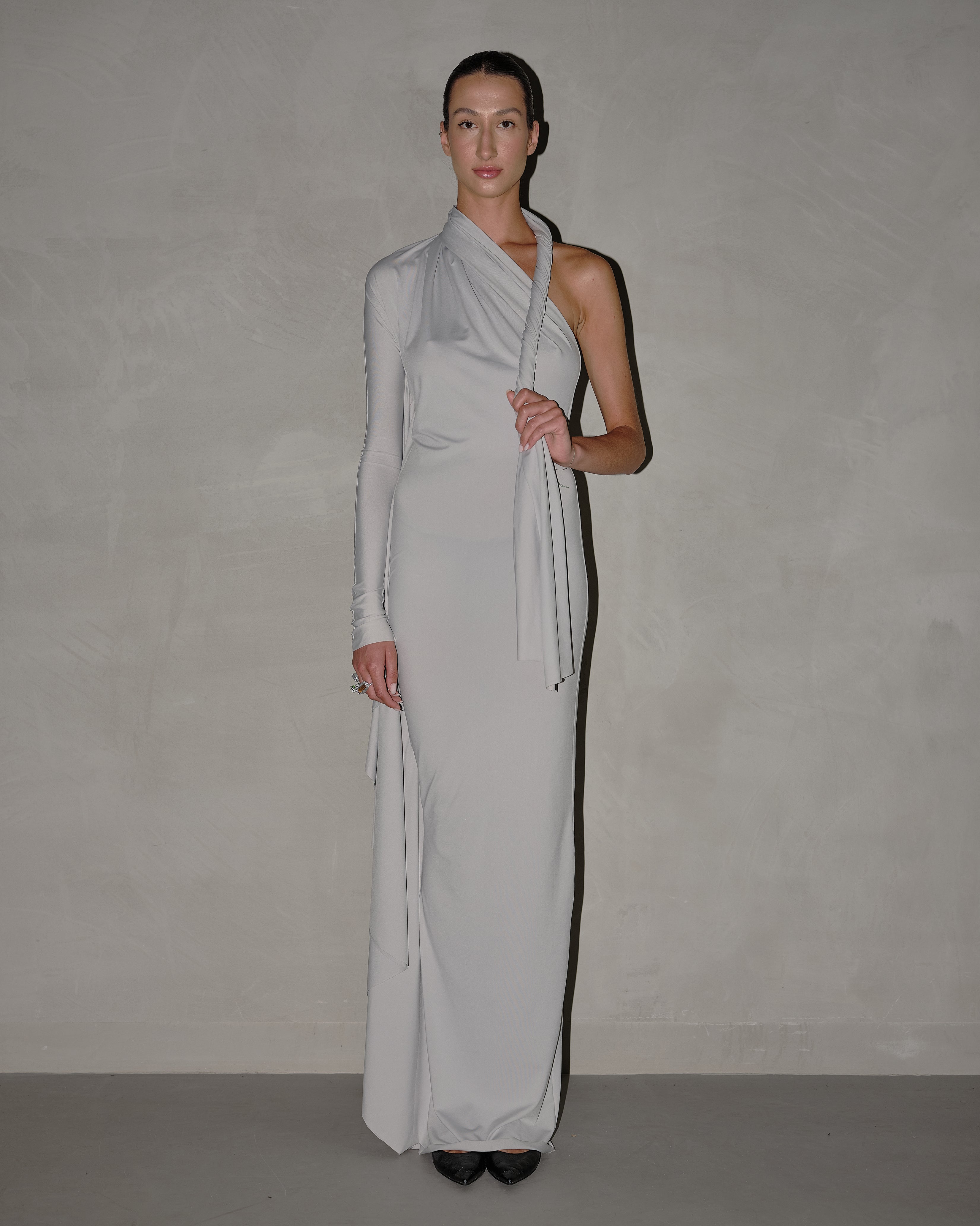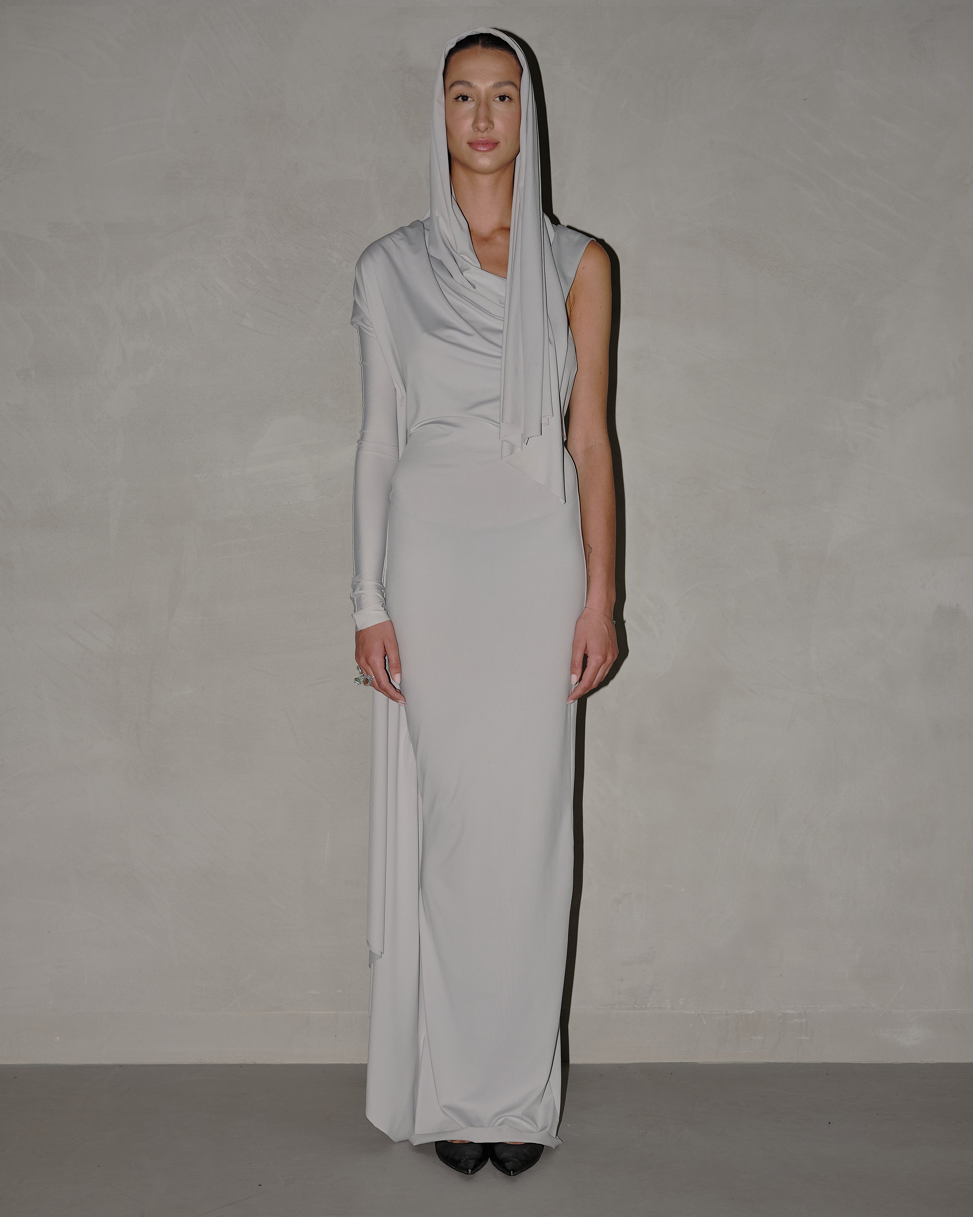 This is THE dress of our Lycra collection. This gown is equal parts mysterious and alluring. The floor-sweeping style features asymmetrical sleeve design and an elongated customisable scarf detail.