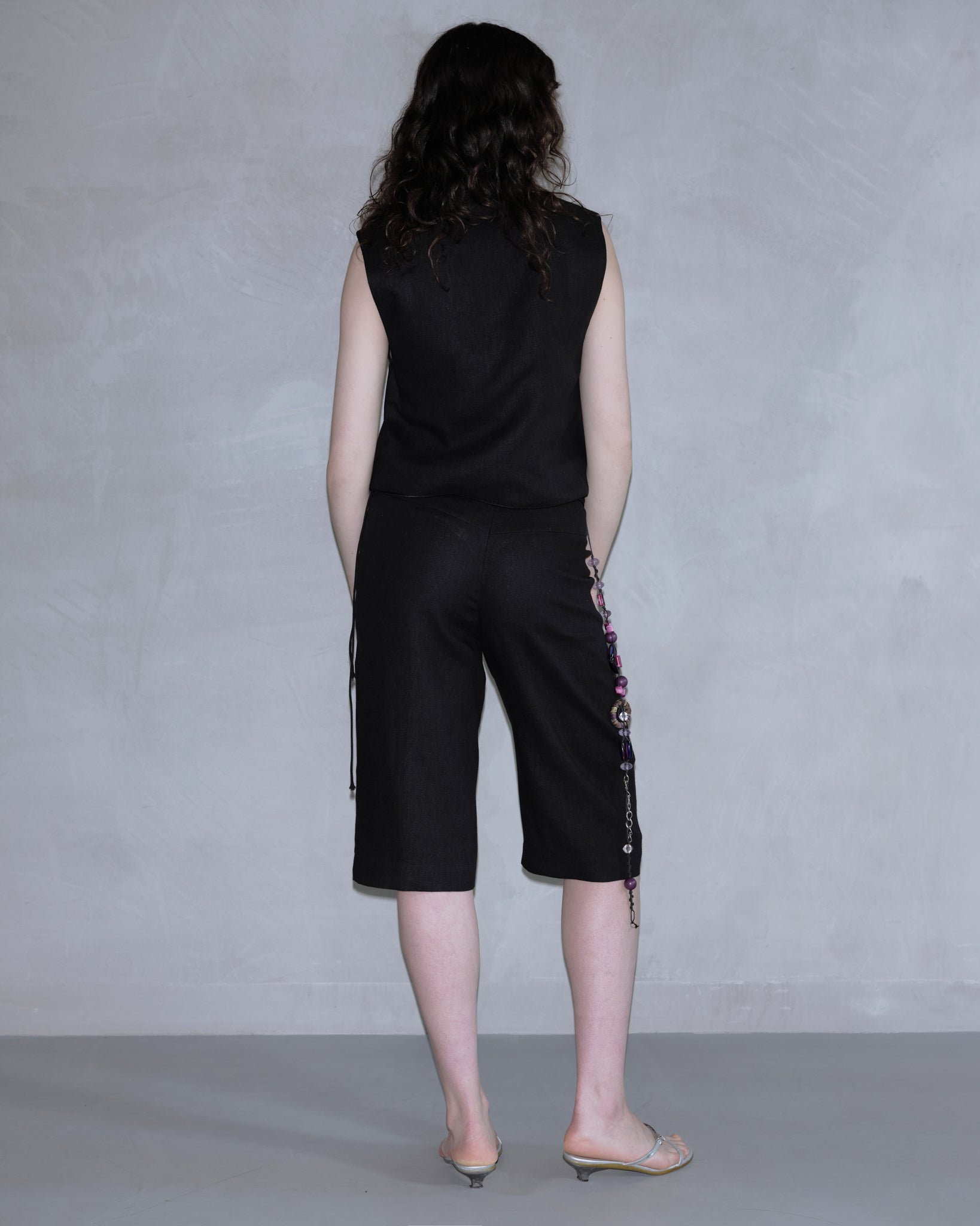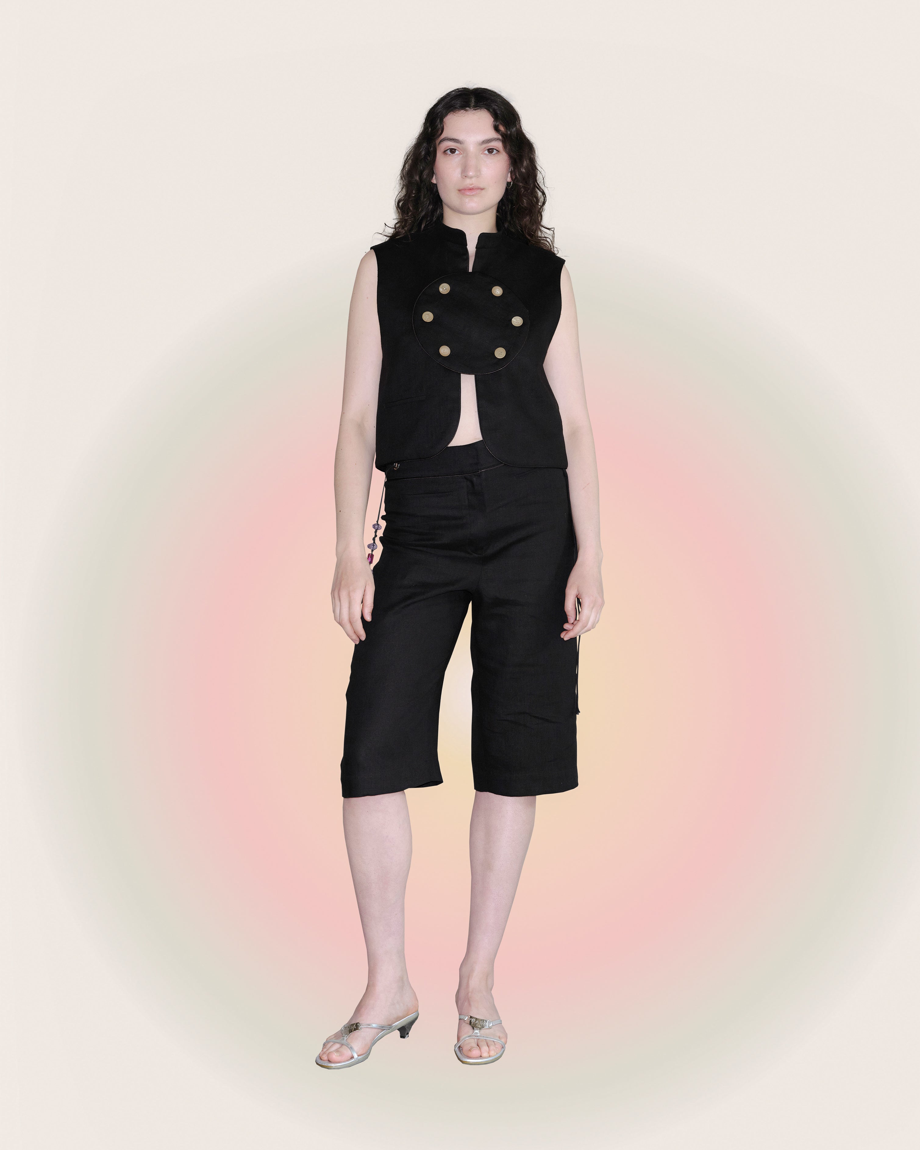 Initially, Sakme Pi Vest was inspired by Lithuanian folklore costumes that were embellished with rectangular and circle-like shapes.