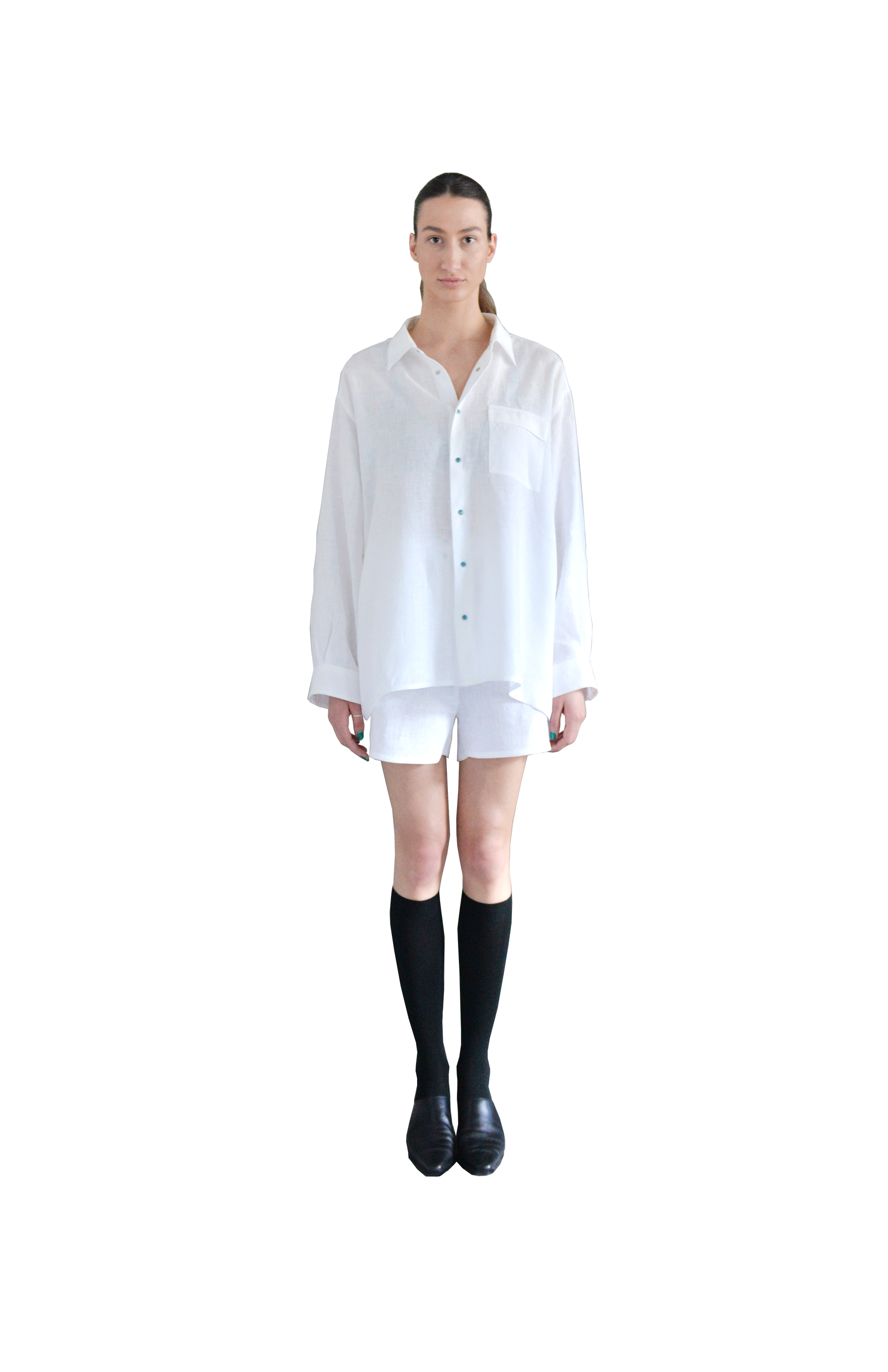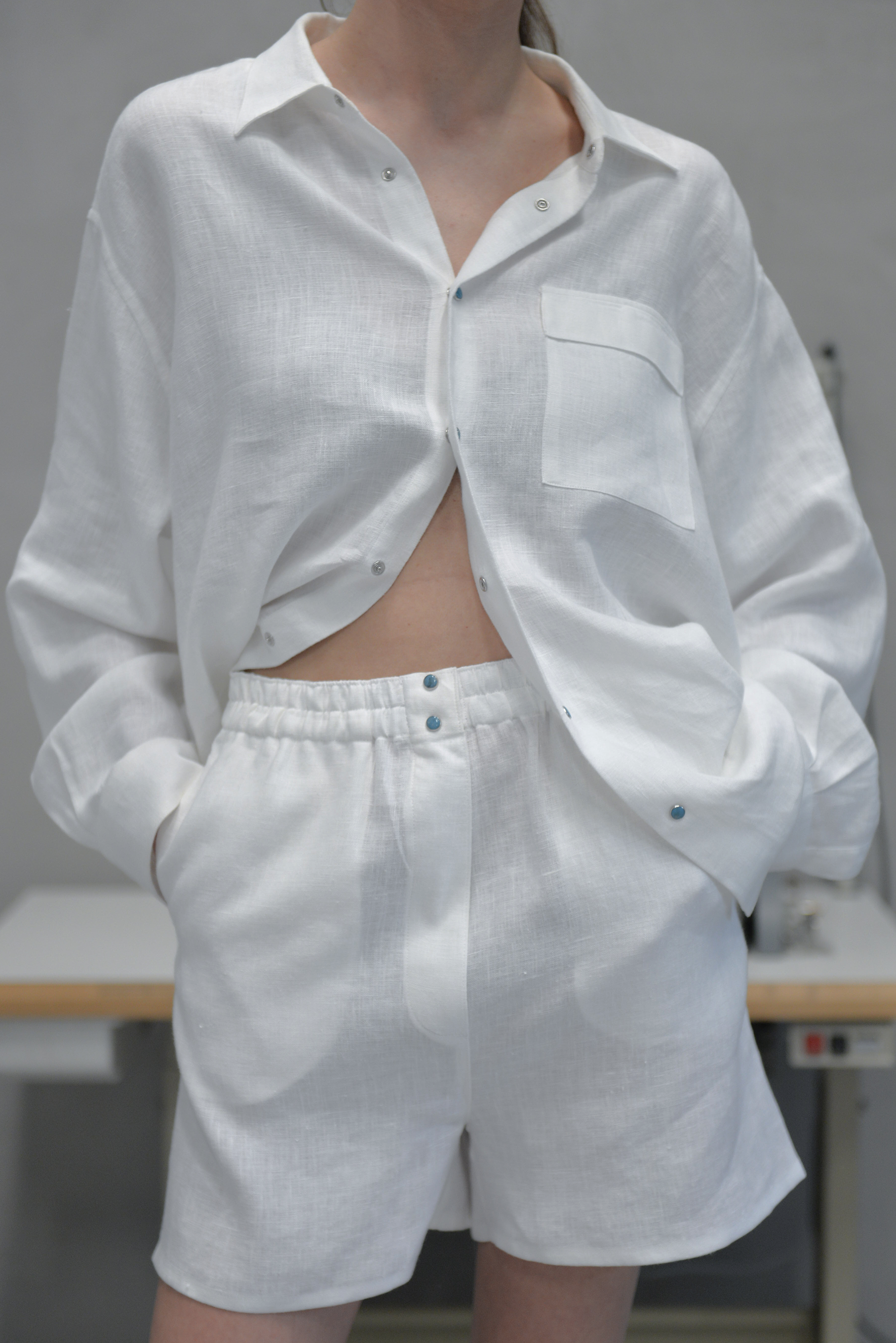 Inspired by vintage menswear silhouettes, these shorts are embellished with two turquoise clip buttons. Made from durable, medium weight, linen material.